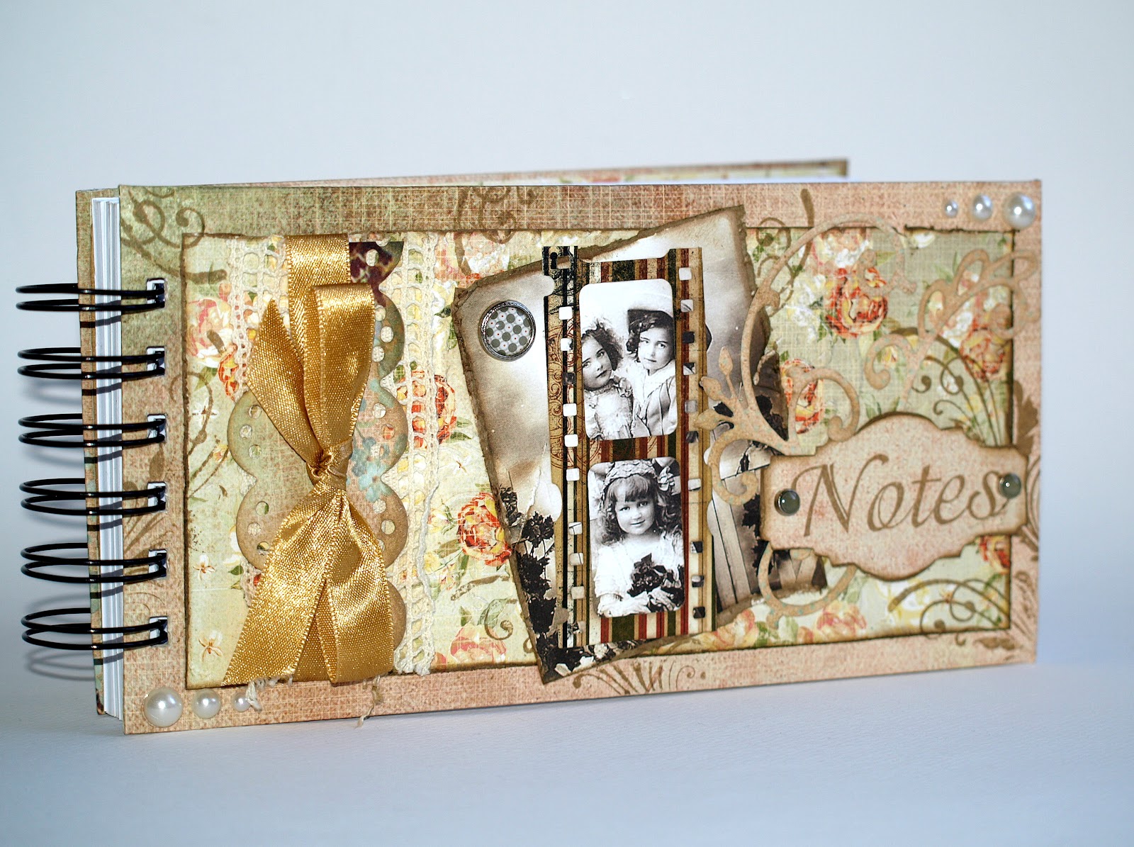 Na specjalne życzenie powstał jeden z poniżej prezentowanych notesów. Do jego stworzenia użyłam, m.in. papierów z Galerii Moniki Niemyjskiej, papierów Kaiserkraft, dodatków Basic Gray, wykrojników i gwoździków Tioma Holza, wykrojników Sizzix oraz Marianne Design ze sklepu ScrapCafe.